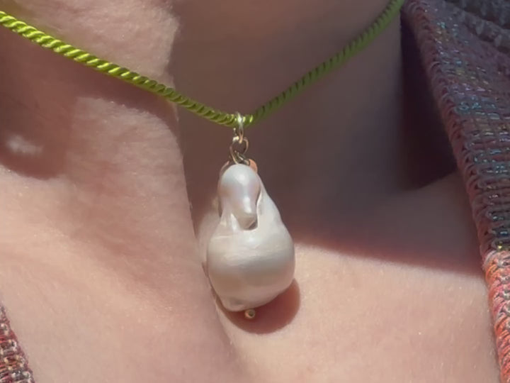 Ciondolo realizzato con perla barocca naturale e maglia in argento 925, ispirato alla leggenda della dea nata dal mare.
