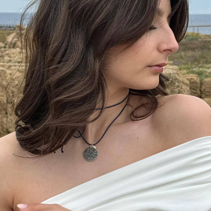 Choker realizato con cordoncino e ciondolo "Soffio di Clori" a forma di rosa, ispirato a una leggenda antica.
